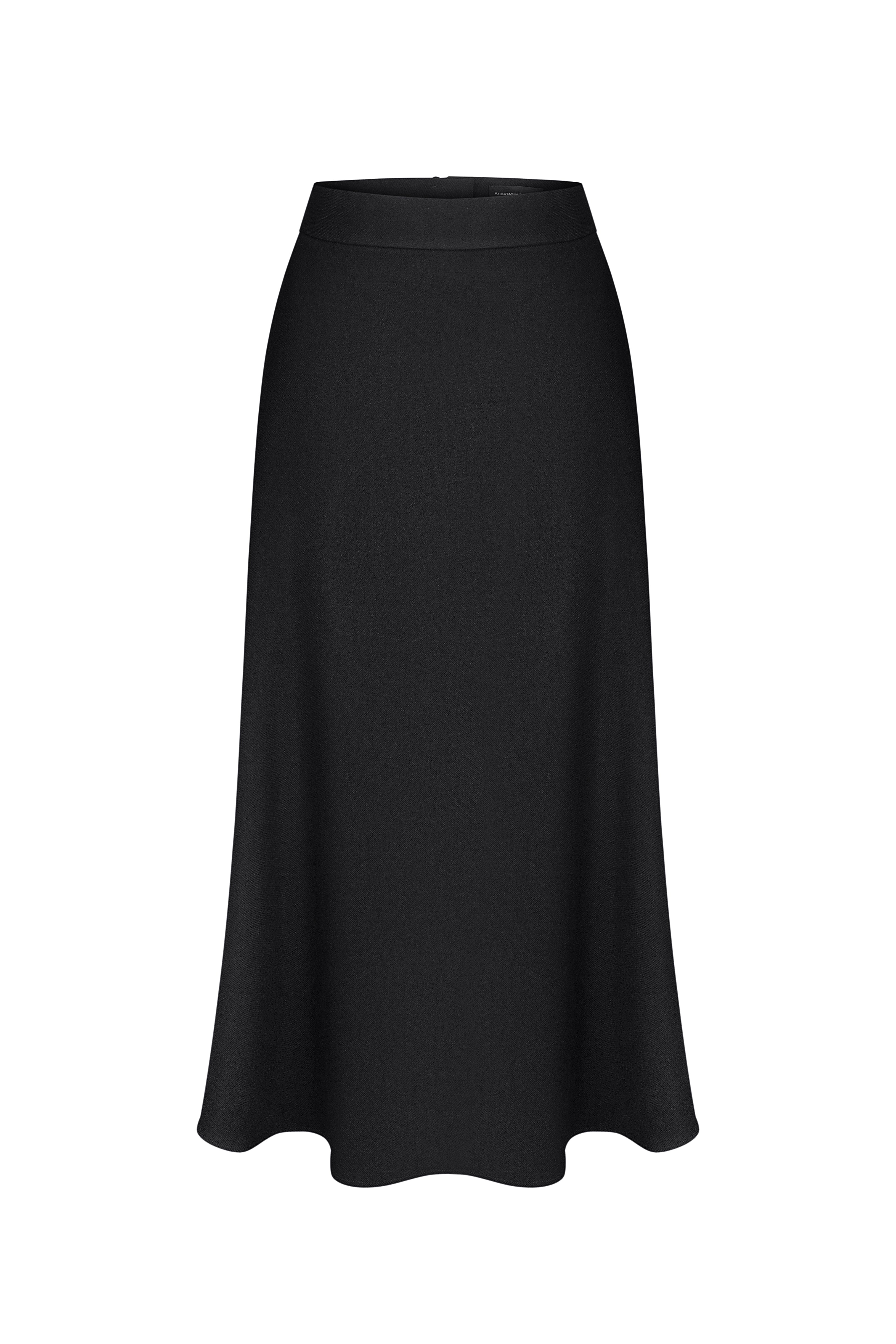 This black midi skirt by Anastasiia Ivanova is a symbol of timeless elegance and effortless movement. Made from premium suiting fabric, it features a slightly flared silhouette that creates graceful motion with every step. The skirt sits perfectly on the waist and is finished with a zipper and two delicate fabric-covered buttons for a refined look.