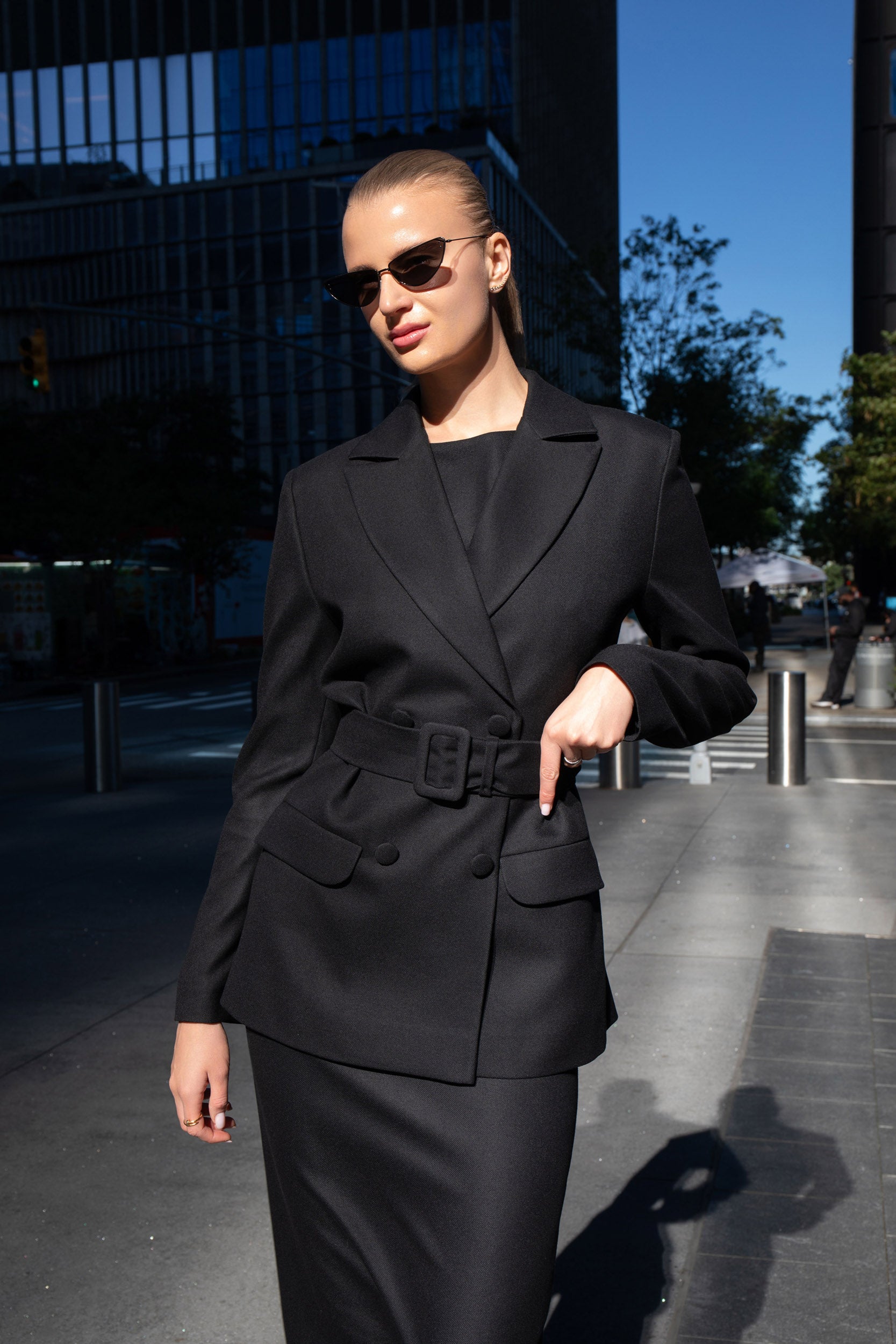 This tailored blazer is the essence of modern sophistication. Made from premium suiting fabric, it features a structured silhouette, defined waistline, and a matching belt with a fabric-covered buckle. The sharp lapels and double-pocket design add a timeless edge, while the fitted cut emphasizes feminine strength.