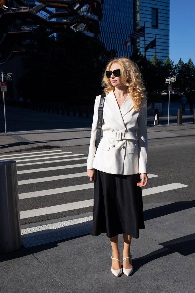 Available in two classic colors – deep black and elegant white, this blazer transitions effortlessly from day to night and pairs perfectly with midi skirts or fitted dresses.
