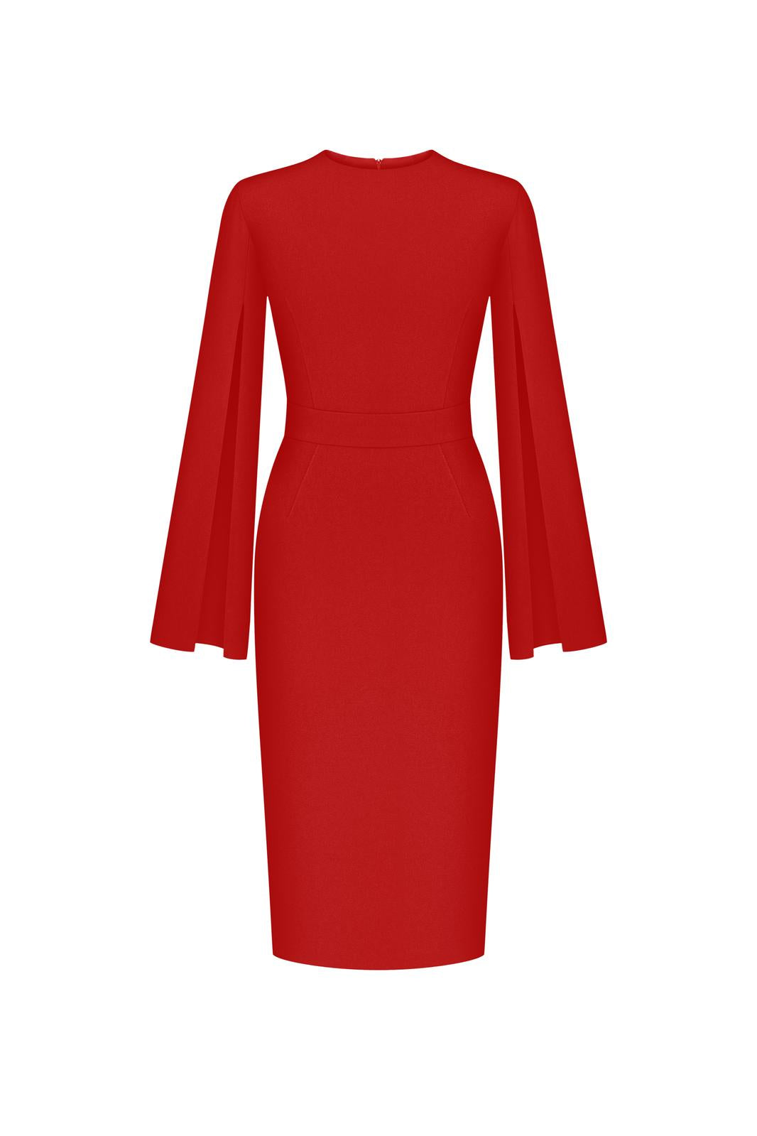 Elevate your elegance with this sophisticated red midi dress featuring a structured silhouette, cape-effect sleeves, and a sleek white belt with a gold-accented buckle. The ensemble is completed with white stiletto heels, a vintage-inspired pearl mini bag, and a classic pearl bracelet, creating a harmonious blend of modern power dressing and timeless femininity.