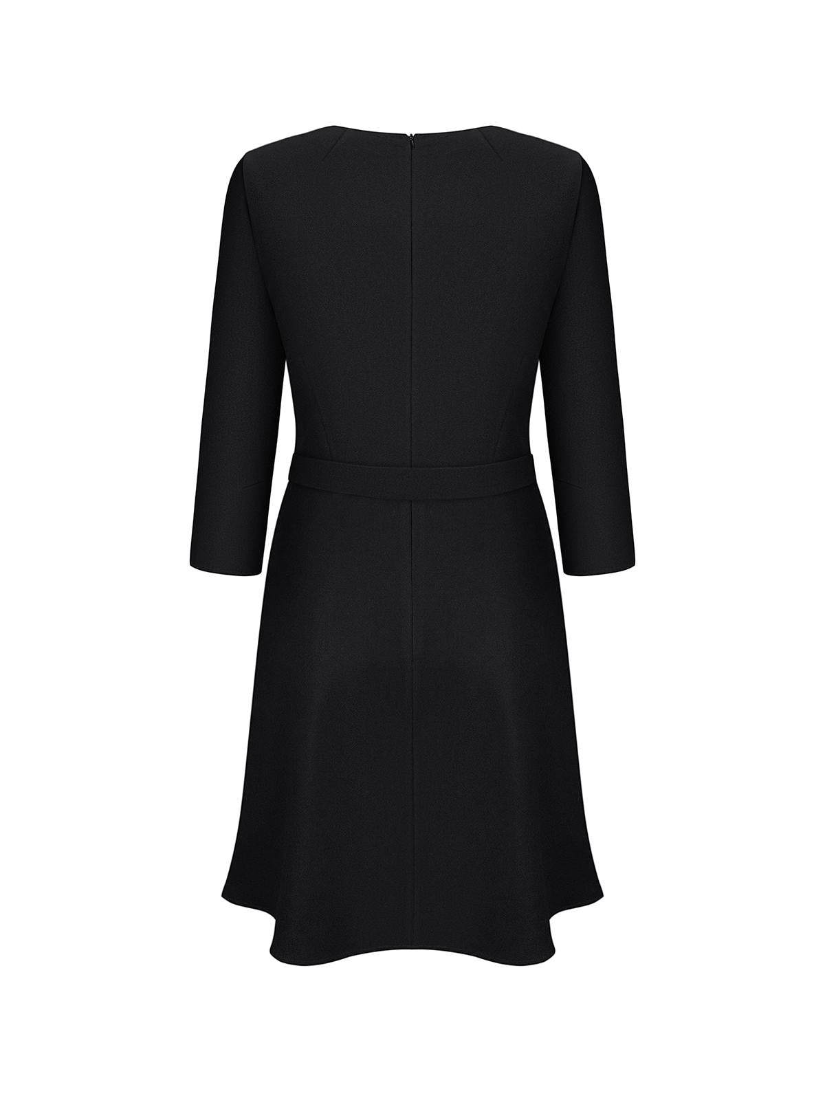 This black dress embodies modern elegance with refined detailing. Made from premium cotton–viscose suiting fabric, it combines natural comfort with a polished silhouette. The fitted bodice and softly flared skirt enhance the figure, while the ¾ sleeves lend an element of understated sophistication. Hand-embroidered pearl bows add couture-inspired charm, balanced by a fabric belt with a pearl buckle that completes the look.