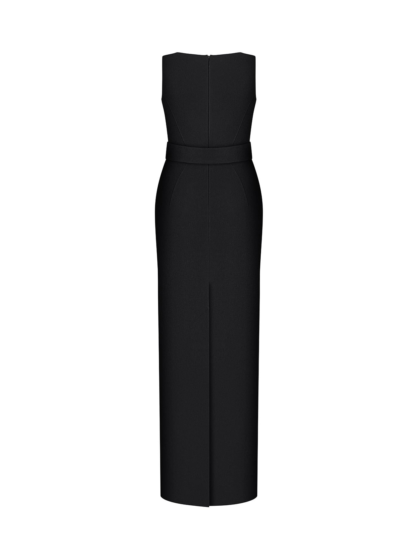 This elegant black maxi dress embodies refined minimalism and timeless grace. Crafted from premium cotton–viscose suiting fabric, it drapes beautifully while maintaining structure. The sleeveless silhouette accentuates the shoulders, while the fitted waist with a matching belt creates a clean, feminine line. Its minimalist cut makes it a versatile piece — ideal for both business elegance and evening sophistication.
