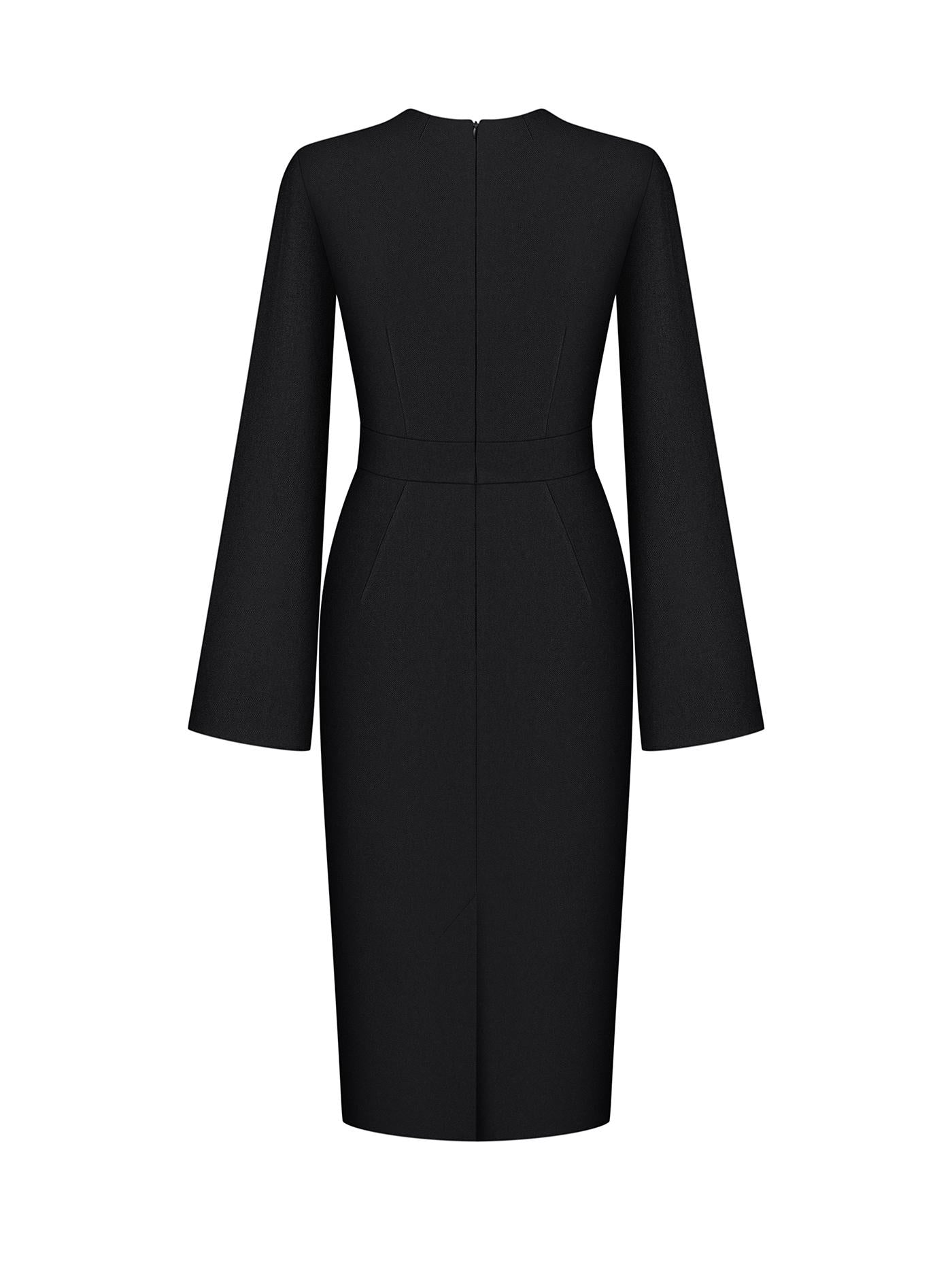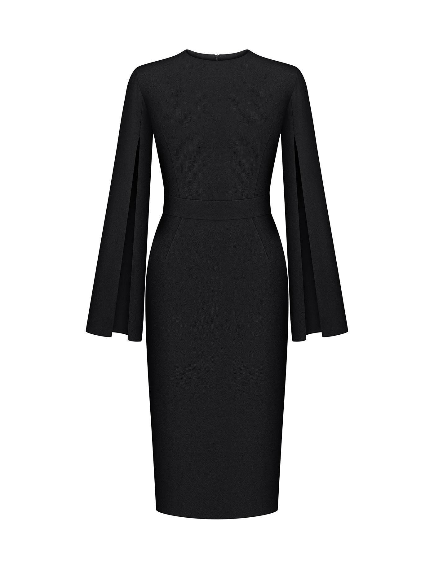 Delicate and sophisticated, it will complement the capsule of a business wardrobe and is suitable for informal meetings as well. The classic fitted cut and deep slit skirt are elegantly combined with the unusual sleeves.