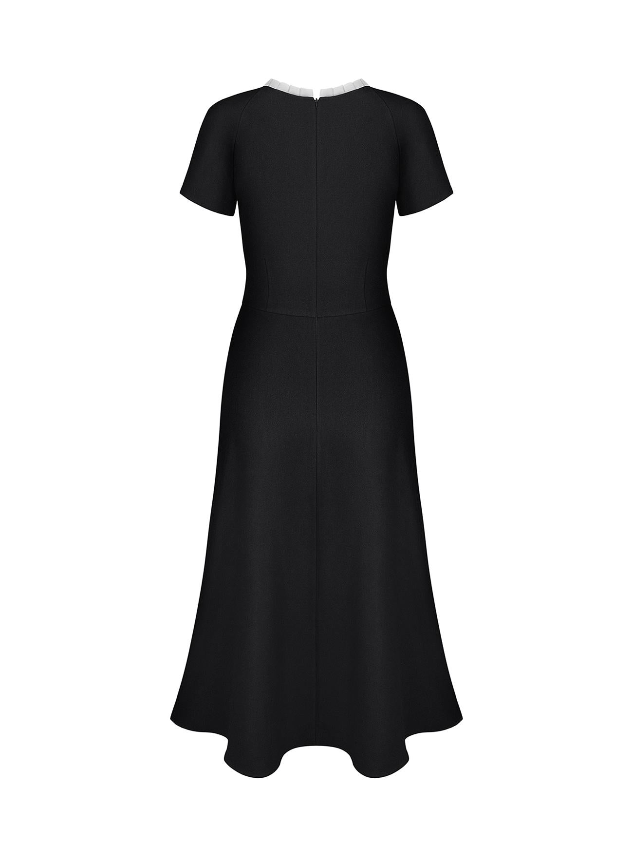 The design is accentuated with white contrasting trims on the collar and decorative chest pockets, while handcrafted pleats add a touch of couture precision. The fitted bodice and flared midi skirt create a feminine silhouette, making it ideal for both daytime elegance and business occasions.
