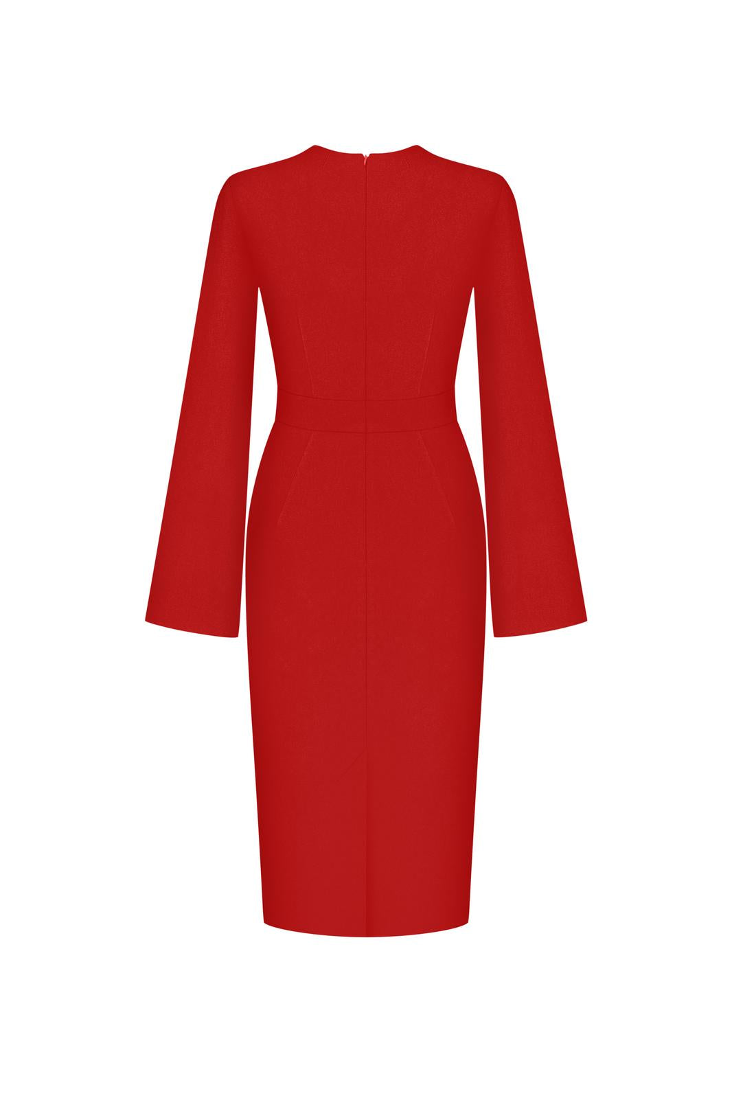 Elevate your elegance with this sophisticated red midi dress featuring a structured silhouette, cape-effect sleeves, and a sleek white belt with a gold-accented buckle. The ensemble is completed with white stiletto heels, a vintage-inspired pearl mini bag, and a classic pearl bracelet, creating a harmonious blend of modern power dressing and timeless femininity.