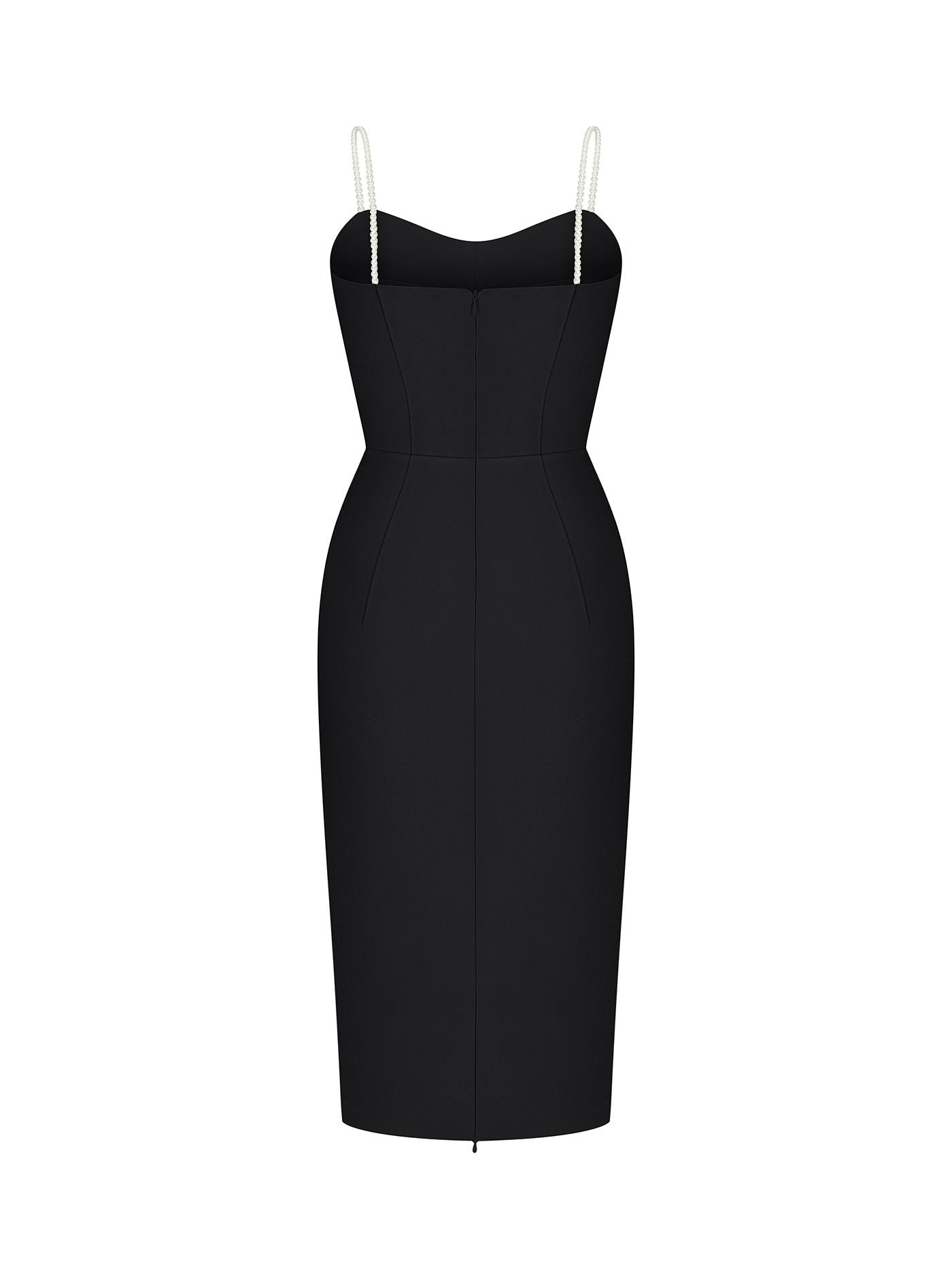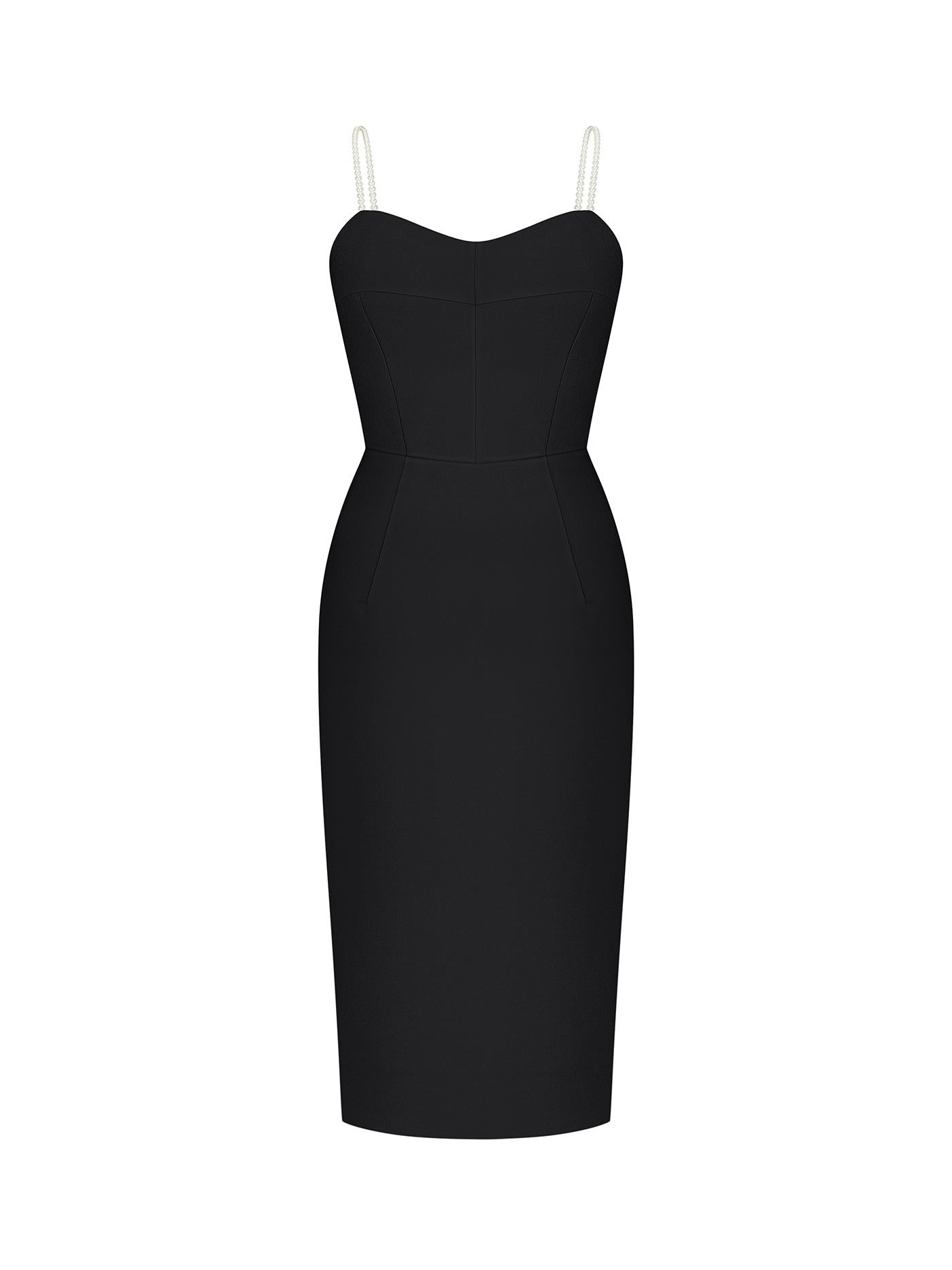 Designed by Anastasiia Ivanova, this Elegant Strappy Midi Dress in Black is a masterpiece of timeless sophistication. Inspired by the allure of classic silhouettes, this dress emphasizes the delicate beauty of the female figure while adding a modern touch with its pearl-adorned straps. The open-back design and subtle slit at the back enhance the graceful curve of the body, making it perfect for elegant evenings and special occasions.