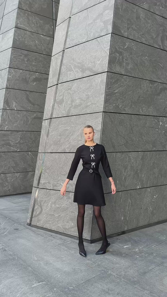 This black dress embodies modern elegance with refined detailing. Made from premium cotton–viscose suiting fabric, it combines natural comfort with a polished silhouette. The fitted bodice and softly flared skirt enhance the figure, while the ¾ sleeves lend an element of understated sophistication. Hand-embroidered pearl bows add couture-inspired charm, balanced by a fabric belt with a pearl buckle that completes the look.